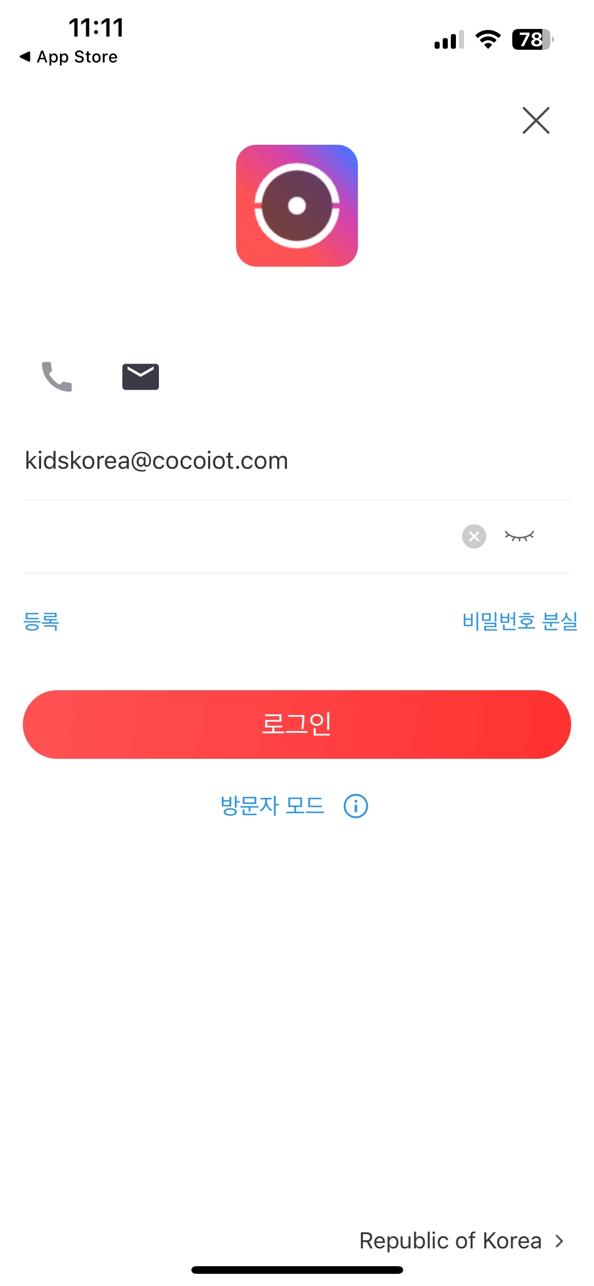 사용자 이름에 kidskorea@cocoiot.com, 암호에 관리자에게 전달받은 암호 입력